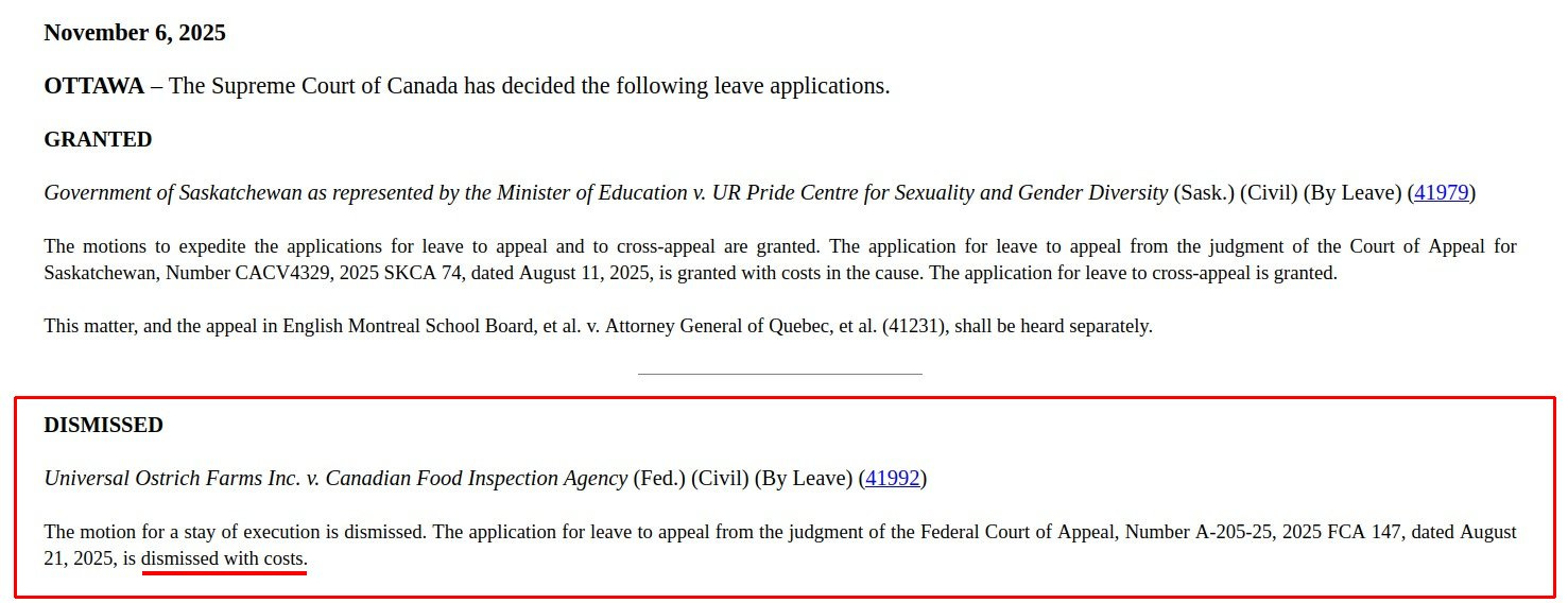 Addendum #1 (2025-11-14): Animal Justice Lodges a Complaint over CFIA’s Ostrich Shooting Method