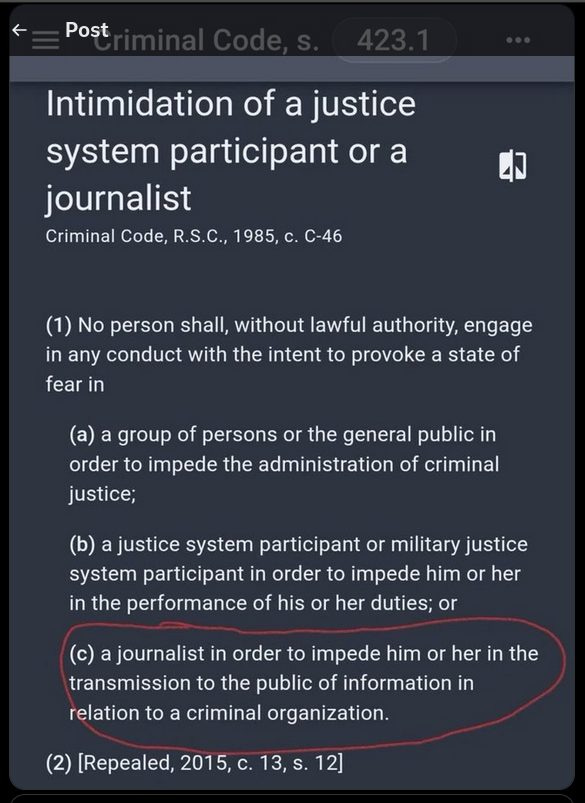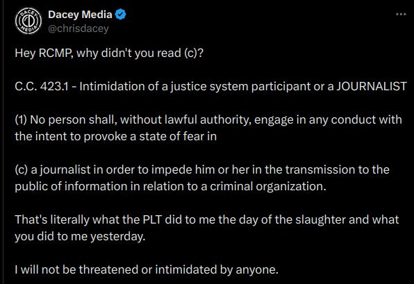 Having had time to have a more thorough and complete look at the law the RCMP agent had cited, Dacey then posted on the following day that section (c) of that very same law that includes a specific clause for the non-intimidation of journalists: