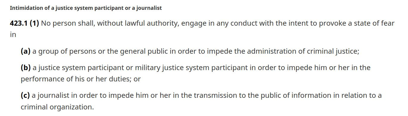 (c) a journalist in order to impede him or her in the transmission to the public of information in relation to a criminal organization. Source: Criminal Code (R.S.C., 1985, c. C-46) Intimidation of a justice system participant or a journalist 423.1 (1)